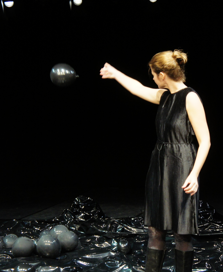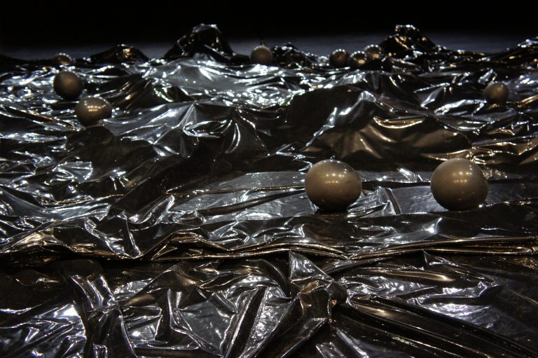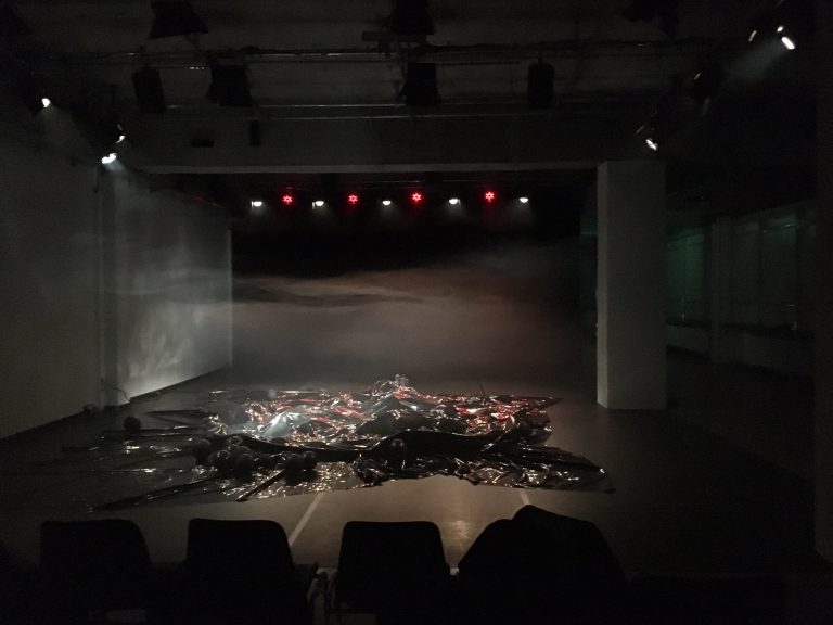 Kein Mensch rĂĽhrt sich – bis ein Mann die BĂĽhne von der Seite betritt. Er steht still, zĂĽckt sein Smartphone, um Fotos von den Zuschauern zu machen, und mischt sich schlieĂźlich unter die Menge. Curveball? Auf der BĂĽhne folgt nun lautes Getöse, und unter der schwarz glänzenden Folie baut sich ein nicht genauer definierbares UngetĂĽm auf – ein Luftschloss, möchte man meinen. (…) ZurĂĽck bleibt ein ratlos lächelndes und um sämtliche vermeintliche Gewissheiten gebrachtes Publikum.